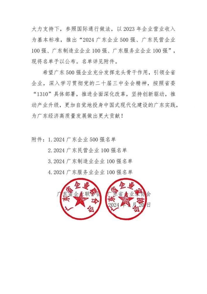 9月20日,廣東省企業(yè)聯(lián)合會、廣東省企業(yè)家協(xié)會在廣州召開以“推進全面深化改革,建設世界一流企業(yè)”為主題的2024廣東500強企業(yè)發(fā)展大會,正式向社會發(fā)布了“2024廣東企業(yè)500強”等多個榜單及其分析報告(以下簡稱“《報告》”)。廣東嘉元科技股份有限公司榮登榜單,位列第360位,連續(xù)兩年獲得該榮譽。