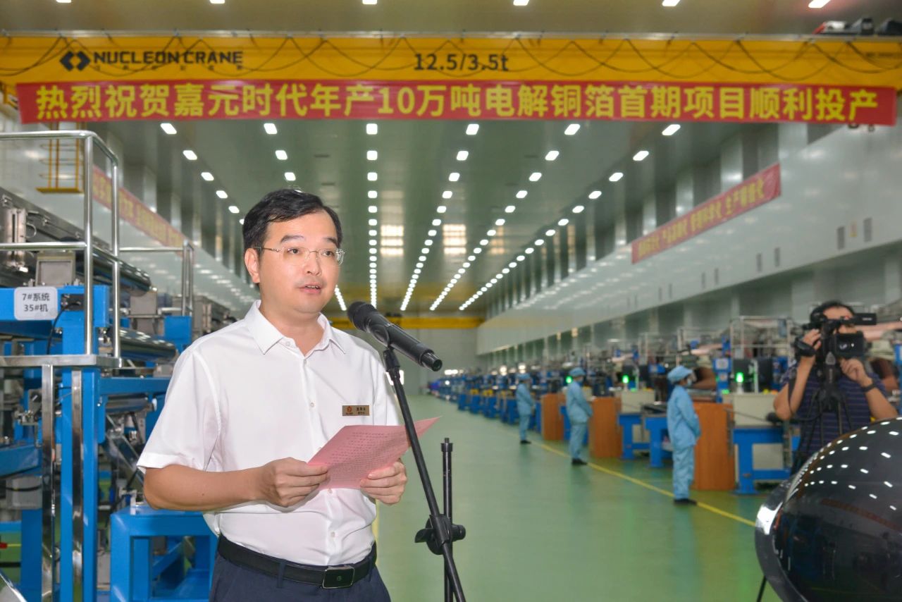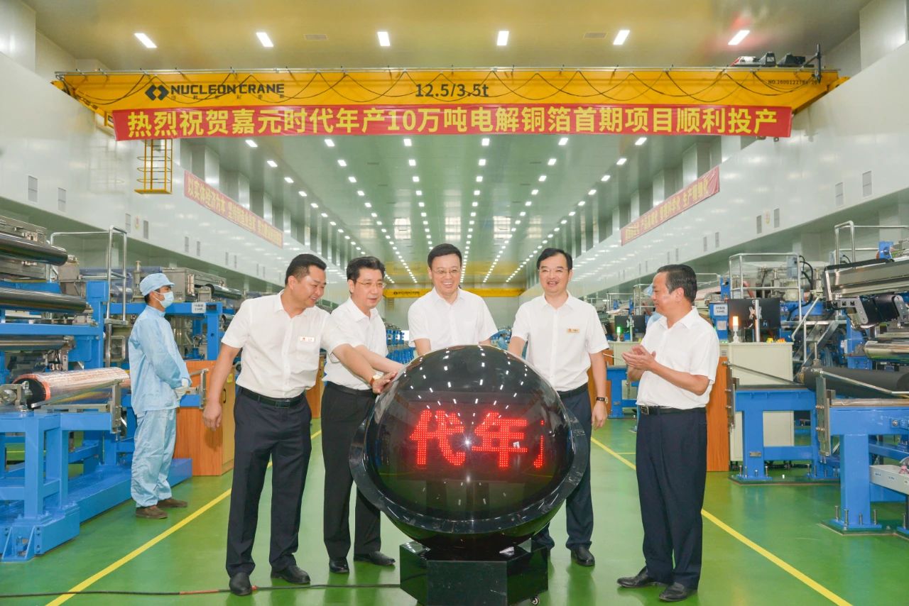 9月28日上午,嘉元時代年產(chǎn)10萬噸高性能電解銅箔首期項目投產(chǎn)儀式在梅縣區(qū)城東鎮(zhèn)上坑村舉行。投產(chǎn)儀式上,梅州市委書記馬正勇,市委副書記、市長王暉,梅縣區(qū)委書記溫助民,廣東嘉元科技股份有限公司董事長廖平元、總裁楊劍文共同點亮啟動球,3號廠房內(nèi)的生箔機(jī)隨即緩緩?fù)鲁鼋瘘S色的銅箔,標(biāo)志著嘉元時代年產(chǎn)10萬噸高性能電解銅箔首期項目順利投產(chǎn)。